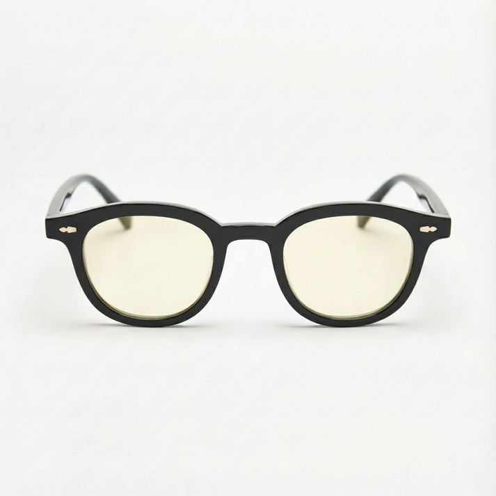 • Frame: Glossy black oval TR90 frame — gold accents add a refined touch that pairs well with the gentle warm tint.