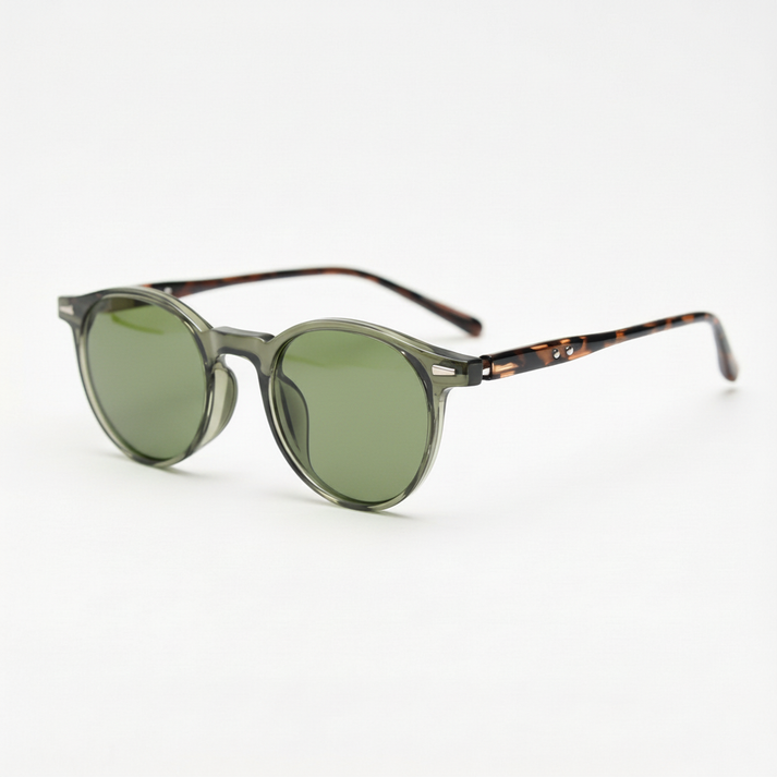 • Green round glasses: translucent olive tone adds character while staying clean and wearable.