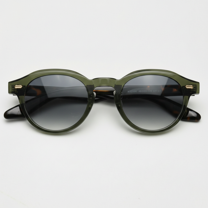 - Frame: Glossy olive-green round TR90 frame - polished circles that keep the gradient looking clean.