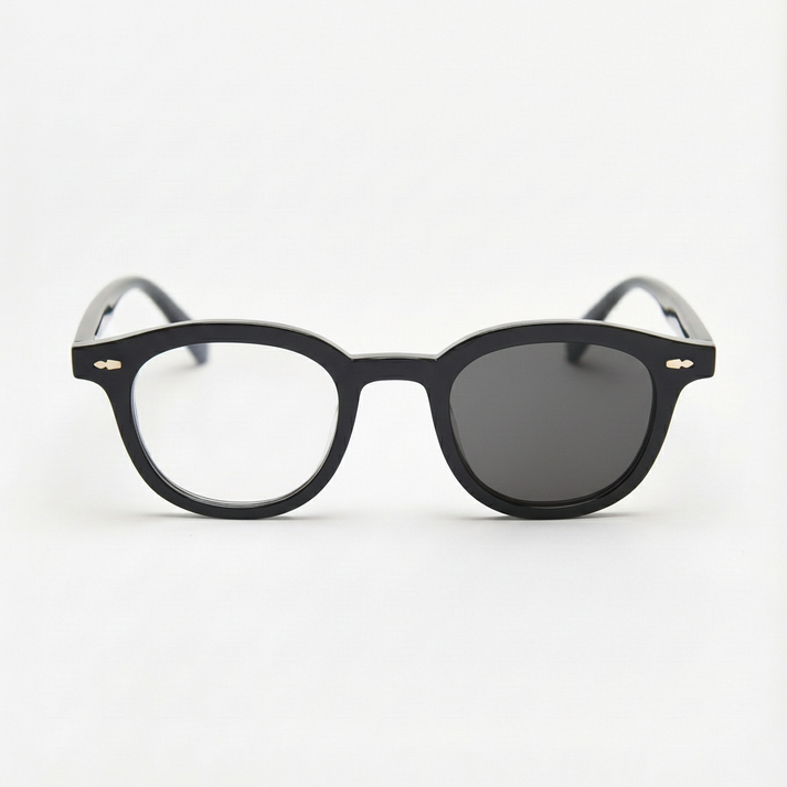 • Frame: Glossy black oval TR90 frame — full-rim lines with subtle gold temple accents that keep the activated grey tint looking sharp.