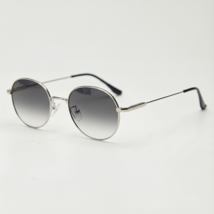 Grey gradient tint lenses shade the bright sky up top and fade lighter below, so your view stays easy when you glance down at a map, menu, or phone. The June Silver round stainless-steel frame adds a polished, cool-metal finish with slim temples and adjustable nose pads for a centered feel. Great for road trips, patio lunches, and everyday city wear when you want a clean ombré look without going too dark.