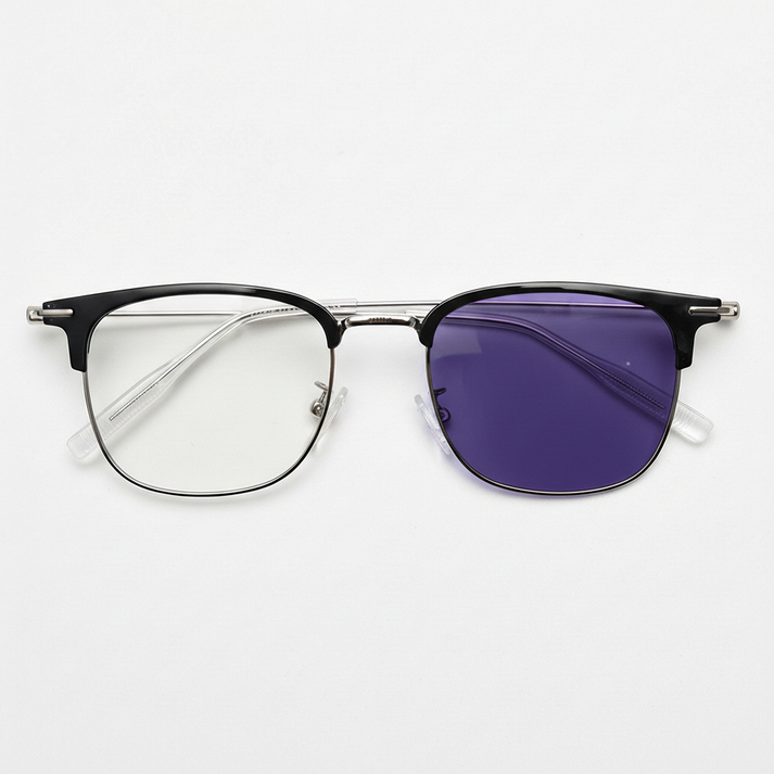 - Frame: Black browline top bar and silver rim keep the purple shift looking clean and intentional.