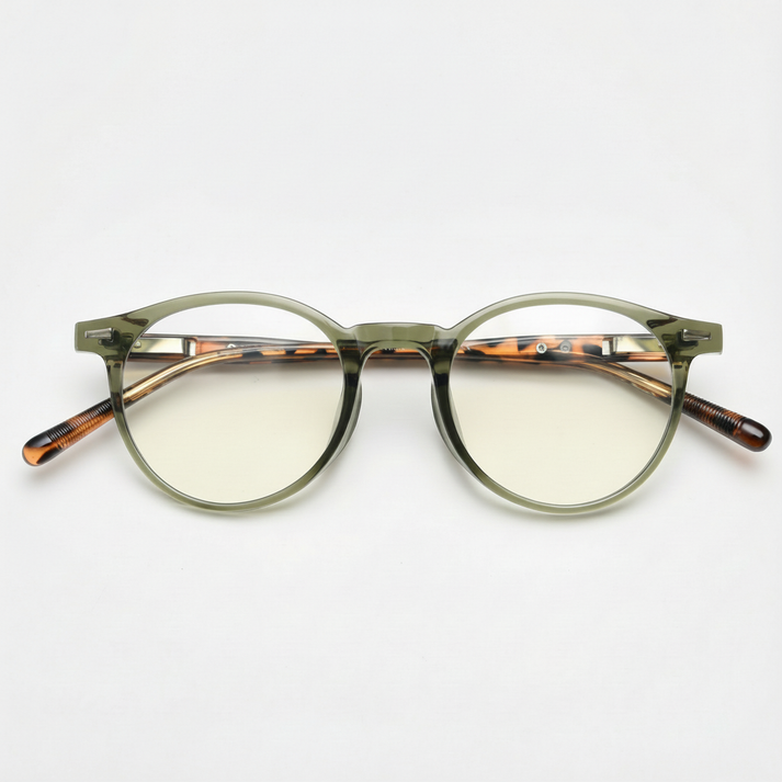 Ida’s translucent olive-green round TR90 frame and tortoise temples make the pair feel soft and approachable, not techy. It’s an easy choice for the library, a window-side desk, and the post-work scroll on your phone when you still want to look put-together all evening long.