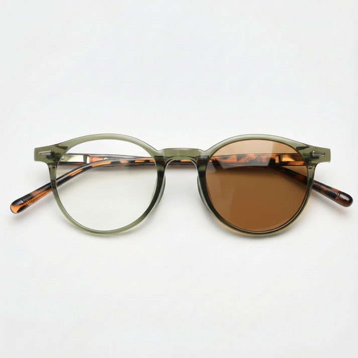 Ida’s translucent olive-green round TR90 frame and tortoise temples keep the palette earthy and relaxed. It’s a great match for midweek commutes, quick lunch patio breaks, and running errands after work—warm outside, easy inside, all in one pair.