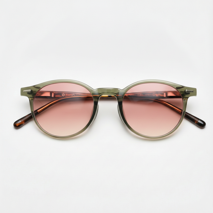 Ida's translucent olive-green round TR90 frame pairs a smooth soft-sheen finish with tortoise temples for a little warmth. Pink gradient tint lenses start rosy up top and fade lighter at the bottom, giving you a flattering glow in mild sun while keeping the view open for reading outside or snapping photos. Think patio brunch, market strolls, and golden-hour walks. The air-light feel stays comfortable all day when you want pink gradient sunglasses that still feel easy.