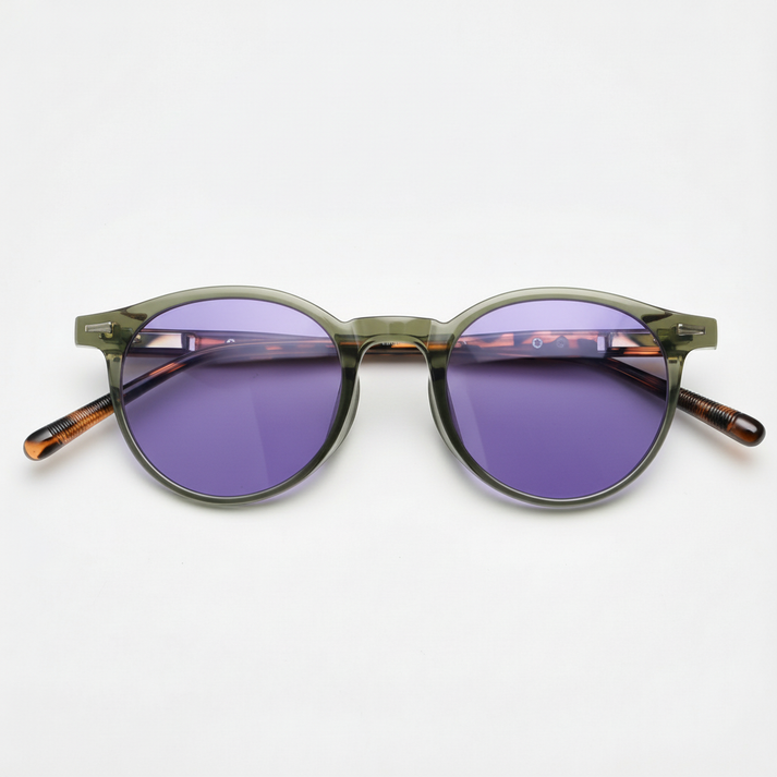 Purple tint lenses bring a cool, artistic washed-out vibe to your vision, reducing brightness while keeping colors discernible. It is a tint for those who want to see the world differently—literally. The violet hue pops against the translucent olive green of the Ida frame, creating a bold, complementary color story. Finished with a glossy polish and featherweight feel, this pair is for the trendsetter who treats eyewear as a form of self-expression.