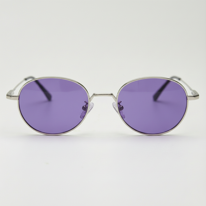 Rich purple tint lenses bring a cool violet wash to mild sun, adding a bold pop that elevates quick street photos. June in Silver keeps everything sharp and understated: polished stainless-steel rounds, slim temples, and adjustable nose pads you can tweak for a steady feel. Together, the clean metal outline makes the purple tone feel intentional, not loud. Wear them for gallery hopping, rooftop sunsets, and downtown coffee runs between plans.