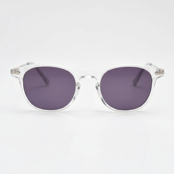Minimalist frame, maximal mood. Lora’s crystal-clear round TR90 frame feels air-light and nearly disappears, while the Purple Tint brings a confident violet wash for mild sun. The cool tone turns bright sidewalks and rooftop light into a photo-ready finish, giving your look a modern, expressive edge without heavy darkness. Wear it for street-style shots, festival afternoons, and golden-hour meetups when you want clear frame sunglasses with purple tint lenses that stand out, cleanly.
