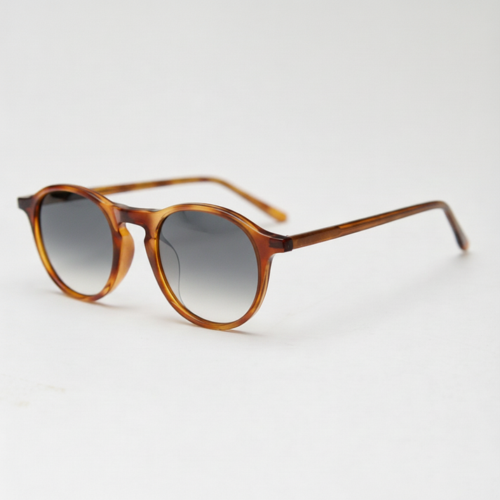 A neutral grey gradient starts darker up top to cut sun glare, then softens into a lighter lower fade for comfortable drives and quick glances down the street. Wrapped in amber tortoise, Moira’s round full-rim TR90 frame feels polished and smooth-touch, with a flexible build that stays steady from morning traffic to late-afternoon errands. Think coastal highway runs, downtown cafe stops, and gallery afternoons—made for people who want a modern neutral lens with a quietly elevated finish.