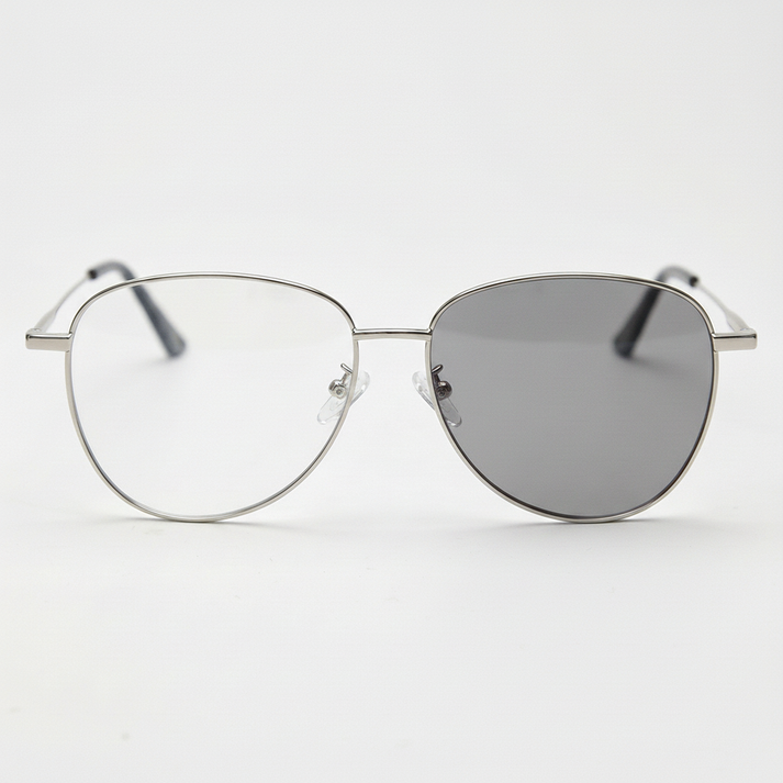 Grey photochromic lenses stay clearer indoors and darken outdoors in sunlight, built for days that keep moving between spaces. Zoe's silver aviator frame keeps it sleek with crisp metal lines and adjustable nose pads for a steady fit. Step out of the station into bright sidewalk glare, then duck into a shaded cafe without changing your look. The tint adapts as the light shifts, so your style stays consistent from morning commute to late-afternoon errands. One pair, clean silver, and a calm view when the sun shows up.